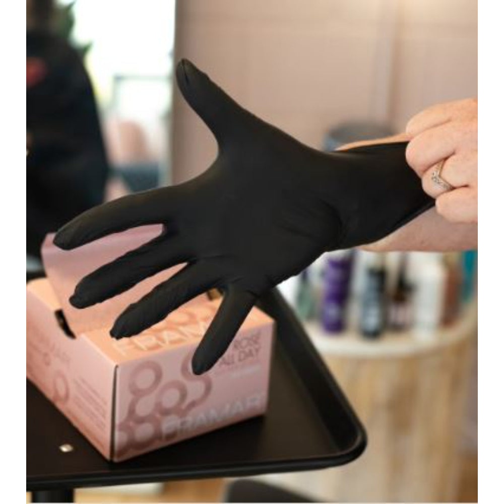 The Framar Midnight Mitts Nitrile Gloves are professional-quality disposable gloves designed for superior protection, comfort, and performance in the salon. Made from durable, latex-free nitrile, these gloves are powder-free, tear-resistant, and provide excellent tactile sensitivity. Perfect for coloring, chemical treatments, and general salon services, they ensure maximum grip and flexibility. The sleek black finish adds a modern, professional touch to your toolkit.