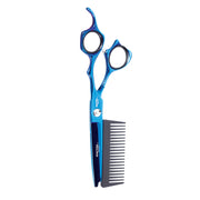 The Kraft Pro Blu Scissor Comb is a unique two-in-one tool designed to make cutting and styling faster, easier, and more precise. Featuring an attached groove comb, it allows smooth partitioning while cutting, reducing the need to switch tools. Built from premium steel with a glossy finish, this scissor is as stylish as it is durable.