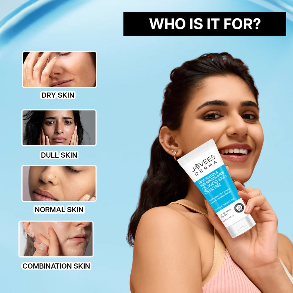 Reveal a fresh, glowing complexion every day with the Jovees Derma Rice Water & 10% Niacinamide Glowing Skin Cleanser.