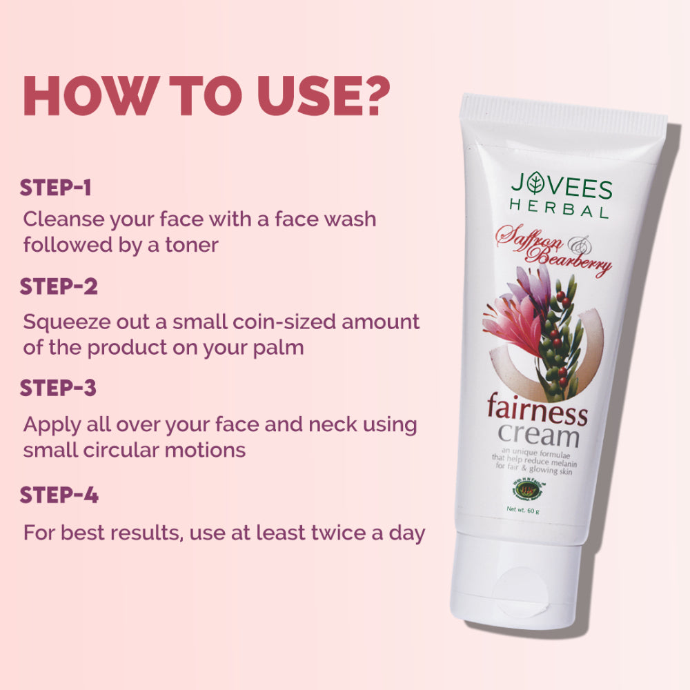 Achieve visibly brighter, smoother, and more even-toned skin with Jovees Saffron & Bearberry Fairness Face Cream — your natural path to radiant, spotless beauty.