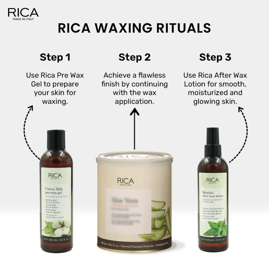 Rica Menthol After Wax Lotion (250 ml) by Rica is a premium Italian formulation designed to soothe and refresh the skin after waxing. Infused with Sunflower Oil and Menthol, it provides a cooling sensation while nourishing and calming the skin. Ideal for professional and home use, this lotion helps reduce redness and irritation for a smooth, comfortable finish.